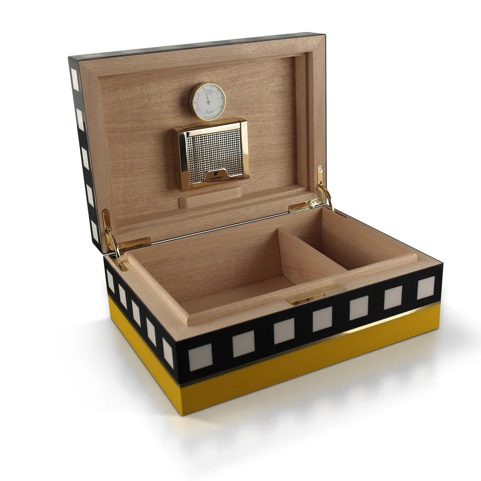 Treat yourself to the luxurious Cohiba Limited Edition 2021 Humidor, crafted with iconic black and white checkered patterns and luxurious yellow accents.